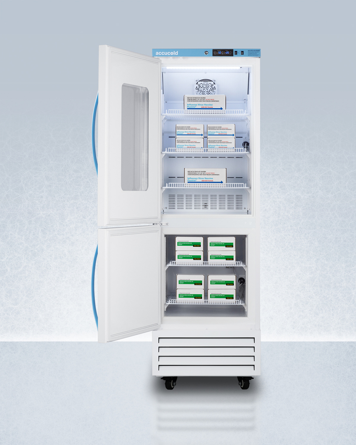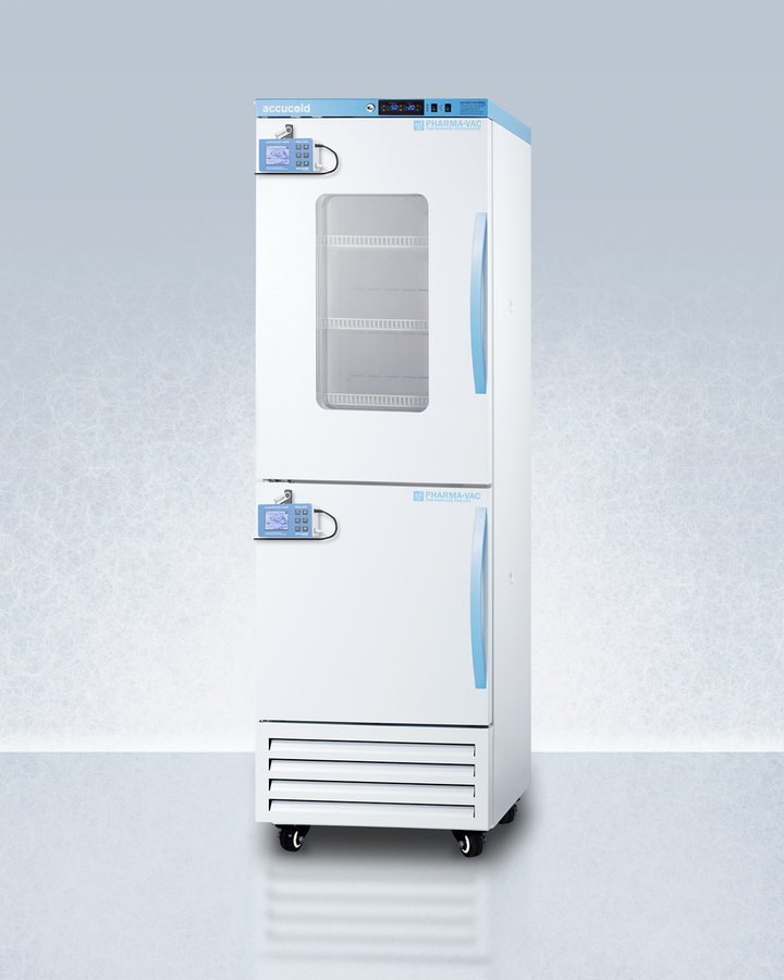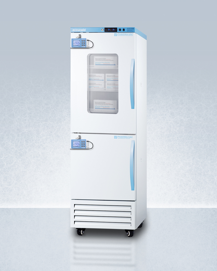 Accucold offers innovative solutions to vaccine and life science storage with the Performance Series dual compressor combination refrigerator-freezers. These units are purpose-built to ensure a stable temperature performance in hospitals, pharmacies, laboratories, and other facilities. Sized just under 24" wide, the ARFG15PVDL2BLHD features an upper refrigerator compartment with a small window and independent manual defrost freezer below. Both sections include adjustable plastic-coated wire shelves that can be positioned at 1/2" increments to accommodate virtually any sized item. This unit includes LED internal lighting with an on/off rocker switch. The interior is constructed from white powder coated metal to ensure added durability and better temperature retention. The Pharma-Vac Performance Series is designed to meet the demanding needs of vaccine and life science storage. The ARFG15PVDL2BLHD features a dual microprocessor temperature controller (refrigerator range: +2 to +8ºC; freezer range: -30 to -10ºC). The buffered temperature probes are encased in glycol-filled bottles to better simulate temperature of the stored product, with an additional sensor that reads air temperature to ensure superior temperature control. The current and min/max temperature display is viewable in Celsius or Fahrenheit to the nearest tenth of a degree. The audible and visual temperature alarms sound if the interiors go out of range. Additional alarms include a power failure alert, door open alarm, and sensor failure alert system. Both sections are equipped with remote alarm contacts in the rear and a 1/2" probe port on the right side to accept additional monitoring devices. The factory-installed antimicrobial handles are powder-coated with naturally occurring silver ions, which help to reduce the spread of germs, allowing for a safer, cleaner user experience. A hospital grade cord with 'green dot' plug is also included for added safety in high traffic areas. Inside, the upper refrigerator compartment utilizes adjustable cycle defrost operation to avoid temperature spikes. Optimized forced air cooling with an internal fan ensures excellent temperature stability and uniformity with rapid recovery after door openings. The freezer utilizes static manual defrost cooling. Both compartments include front-mounted keyed locks and powerful magnetic gaskets to ensure a positive seal, with self-closing doors for added protection in high traffic settings. Pre-installed hospital grade casters offer easy mobility as needed, with the front two wheels lockable to keep the unit in place. This unit ships with a left hand door swing. We also include two DL2B digital data loggers to be mounted to the door, a feature recommended by the CDC, VFC and VFA for vaccine storage. This password-protected DDL is NIST calibrated in our ISO/IEC 17025:2017 accredited laboratory and offers a large LCD display of the current and high/low temperature, recording up to 32,000 data groups to its internal memory or even more on the included 4GB USB flash drive. Data can be viewed through a PC or Mac in Microsoft Excel or any .CSV compatible program. Users can set their own recording intervals starting at increments of 10 seconds to best meet a facility's specific logging needs. Each logger comes with a 2-year certificate of calibration beginning the date of manufacture. The logger can be re-calibrated in our laboratories after the certificate expires. (For additional information on the DDL, see the DL2BKit listing on our website.) Additional sizes and styles are available. Browse Accucold's website for more information, or contact our sales team at 718-893-3900 to discuss your equipment needs.