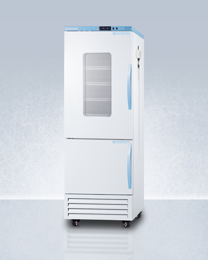 Accucold offers innovative solutions to vaccine and life science storage with the Performance Series dual compressor combination refrigerator-freezers. These units are purpose-built to ensure a stable temperature performance in hospitals, pharmacies, laboratories, and other facilities. Sized just under 28" wide, the ARFG18PVDLPWLHD features an upper refrigerator compartment with a small window and independent manual defrost freezer below. Both sections include adjustable plastic-coated wire shelves that can be positioned at 1/2" increments to accommodate virtually any sized item. This unit includes LED internal lighting with an on/off rocker switch. The interior is constructed from white powder coated metal to ensure added durability and better temperature retention. The Pharma-Vac Performance Series is designed to meet the demanding needs of vaccine and life science storage. The ARFG18PVDLPWLHD features a dual microprocessor temperature controller (refrigerator range: +2 to +8ºC; freezer range: -30 to -10ºC). The buffered temperature probes are encased in glycol-filled bottles to better simulate temperature of the stored product, with an additional sensor that reads air temperature to ensure superior temperature control. The current and min/max temperature display is viewable in Celsius or Fahrenheit to the nearest tenth of a degree. The audible and visual temperature alarms sound if the interiors go out of range. Additional alarms include a power failure alert, door open alarm, and sensor failure alert system. Both sections are equipped with remote alarm contacts in the rear and a 1/2" probe port on the right side to accept additional monitoring devices. The factory-installed antimicrobial handles are powder-coated with naturally occurring silver ions, which help to reduce the spread of germs, allowing for a safer, cleaner user experience. A hospital grade cord with 'green dot' plug is also included for added safety in high traffic areas. Inside, the upper refrigerator compartment utilizes adjustable cycle defrost operation to avoid temperature spikes. Optimized forced air cooling with an internal fan ensures excellent temperature stability and uniformity with rapid recovery after door openings. The freezer utilizes static manual defrost cooling. Both compartments include front-mounted keyed locks and powerful magnetic gaskets to ensure a positive seal, with self-closing doors for added protection in high traffic settings. Pre-installed hospital grade casters offer easy mobility as needed, with the front two wheels lockable to keep the unit in place. This unit ships with a left-hand door swing. This unit ships with PharmaWatch DLPWRF, a wireless environmental temperature monitoring device (ETM) that enables cloud-based data management. The ETM comes with a refrigerator and freezer probe to record both compartment temperatures via the latest cellular technology. Reports are managed in the included web portal for your records. Temperature alert notifications can be sent via text, call, or email. The device can be mounted to the front or side of the unit. It includes a 2-year certificate of NIST calibration, A/C adapter with 10' long cord, and backup battery. Additional sizes and styles are available. Browse Accucold's website for more information, or contact our sales team at 718-893-3900 to discuss your equipment needs.