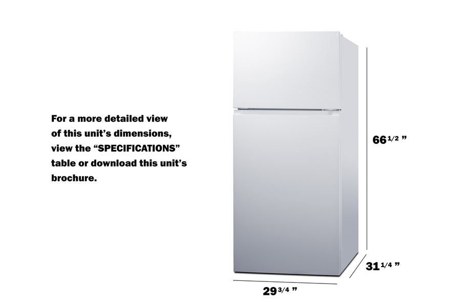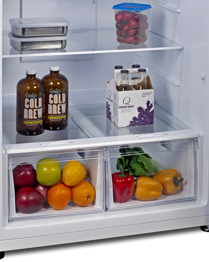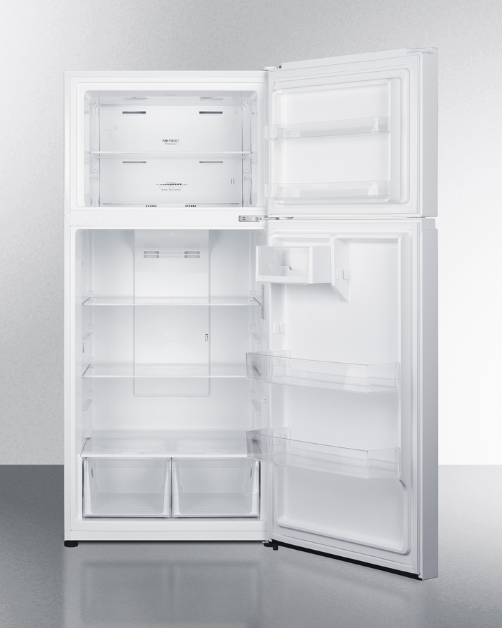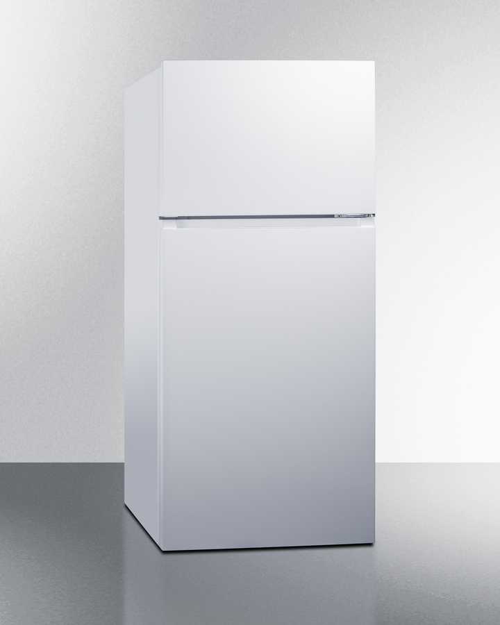 Summit's fully-featured, top-mount refrigerator-freezers are specially designed to bring modern style and true convenience to any kitchen. Made in North America, model FF18W is a 30" wide ENERGY STAR-certified top-mount refrigerator-freezer that offers over 18 cu.ft. of storage capacity. Classic white doors feature pocket handles, with a smooth white cabinet for a timeless look in any kitchen. This unit has a sealed rear and right-angle cord for a better fit. Both doors are user-reversible to best suit your space. Inside, the FF18W comes fully featured for convenient storage. The refrigerator section includes adjustable spill-proof glass shelves and two clear crispers with humidity-control for optimum produce storage. The refrigerator's door includes two full gallon racks and a covered butter rack. The fresh food section features intuitive touch controls and LED lighting. The spacious freezer compartment includes its own dial thermostat for exact temperature control, two door shelves, and an adjustable glass shelf. This refrigerator-freezer ships icemaker-ready for aftermarket setup. We also offer a version with a factory-installed icemaker (model FF18WIM). Model FF18W is designed to operate efficiently in non-climate-controlled environments like garages, where temperatures can fluctuate. With its ENERGY STAR certified performance, attractive design, and convenient features, the FF18W is the ideal choice for kitchens looking for an energy-efficient refrigerator-freezer. For this unit in a stainless steel finish, see model FF18SS.