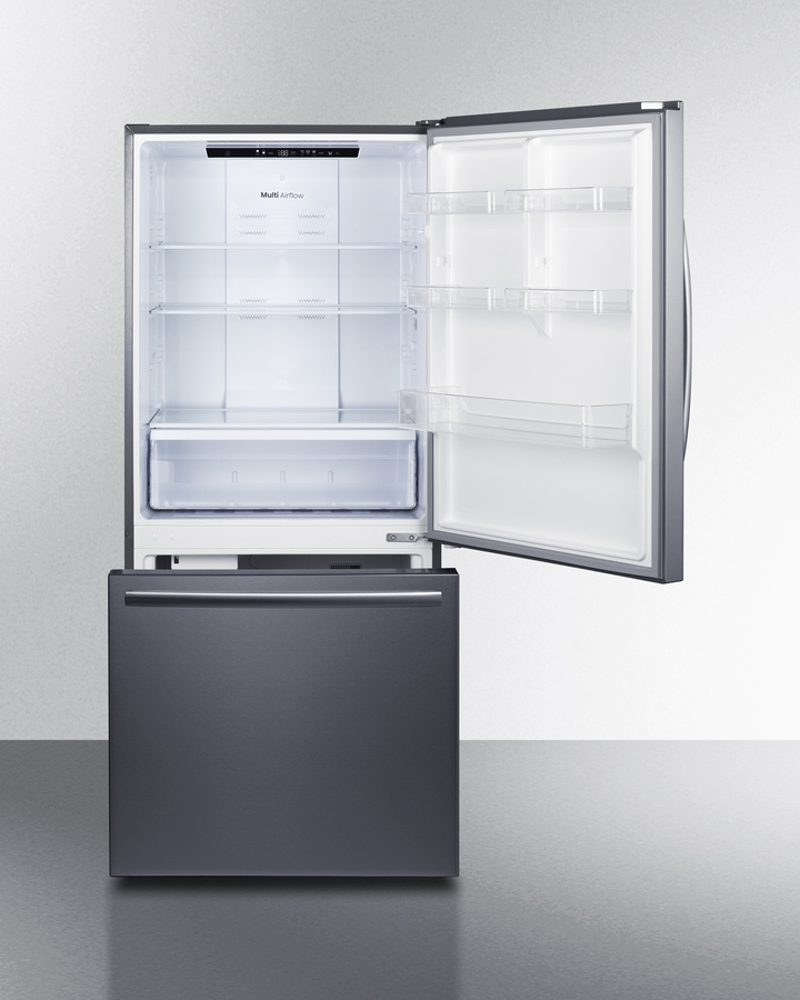 Frost-free ENERGY STAR certified bottom freezer refrigerator with icemaker in stainless steel