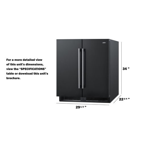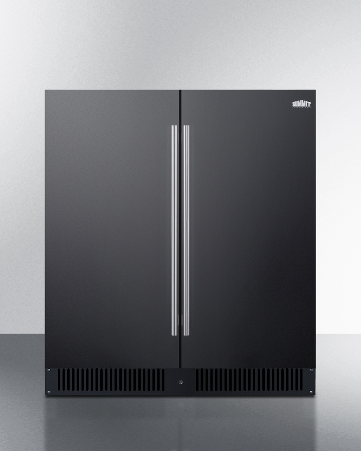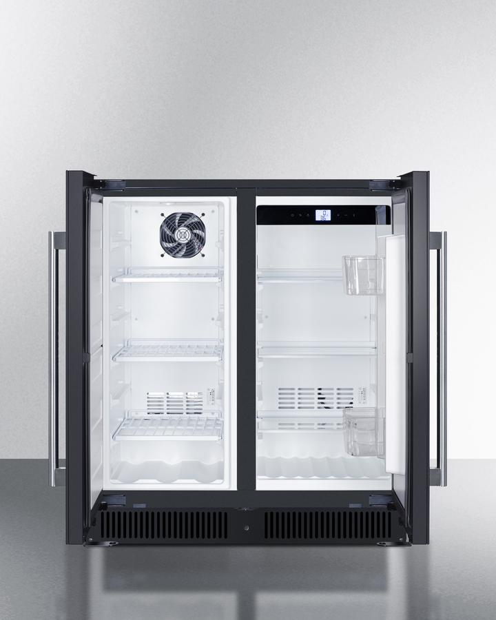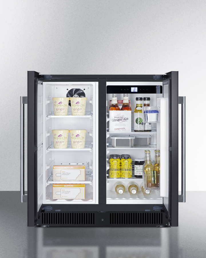 Summit manufactures unique refrigeration solutions to combine full functionality and custom style under the counter. Sized at 30" wide, the FFRF3070BL is an all-in-one side-by-side refrigerator-freezer. The front-breathing design allows built-in installation under counters, while the fully finished black cabinet also enables freestanding use. French doors allow you to separately store refrigerated and frozen foods. This unit comes in a jet black finish. The European style fully articulating hinging ensures seamless integration into your space. This unit includes a lock in the kickplate to secure both sections. A sealed back and right angle plug offer added space savings. Inside, the FFRF3070BL features a frost-free freezer compartment on the left and a frost-free refrigerator compartment on the right. The refrigerator includes a digital thermostat allowing users to manage the temperature in each compartment, with a readout in Celsius or Fahrenheit for added convenience. Adjustable glass shelves offer cleaner spill-proof storage for fresh food items, while two removable door shelves provide additional storage space as needed. The freezer compartment includes adjustable wire shelves to ensure proper cold air circulation. Both sides feature LED lighting to provide an attractive, energy efficient presentation. The slotted floor design is ideal for keeping bottles safely in place. Additional features include an open door alarm, high temperature alarm, and Sabbath mode setting that allows you to disable certain functions during religious observance. With its innovative all-in-one design, user-friendly features, and full frost-free operation, the FFRF3070BL is a great choice for smaller kitchens looking to maximize storage space under the counter. Additional choices are available in white and stainless steel, and with panel-ready doors for a custom look. Browse the full Summit selection to discover the perfect fit for your space.