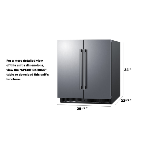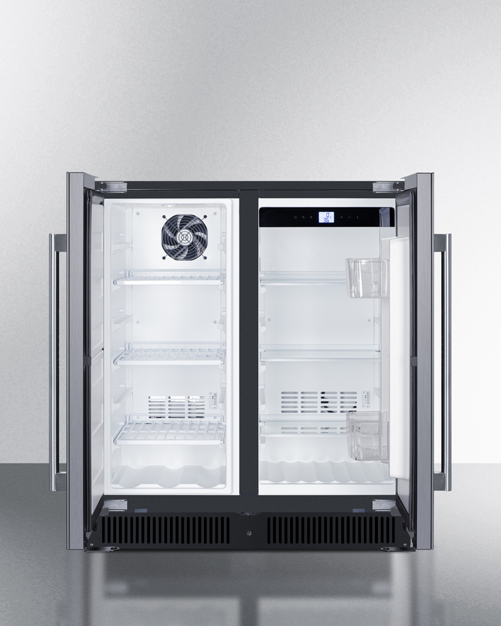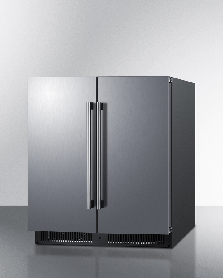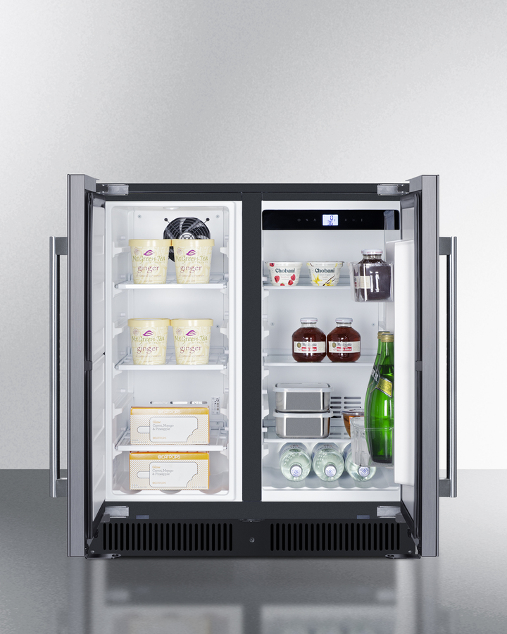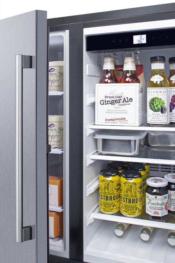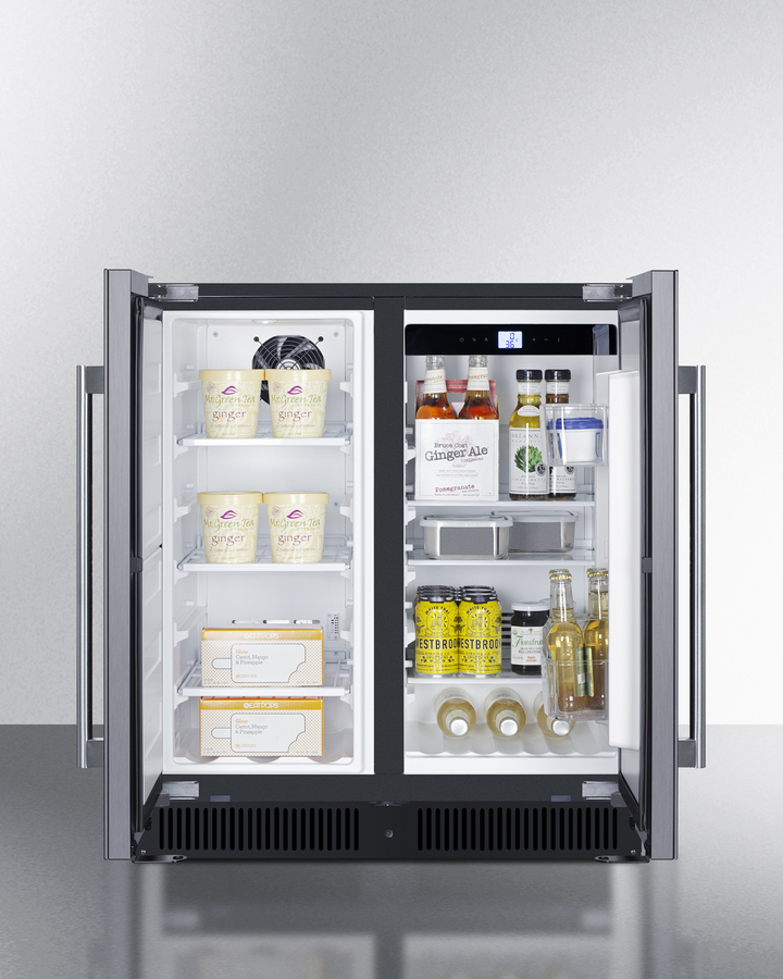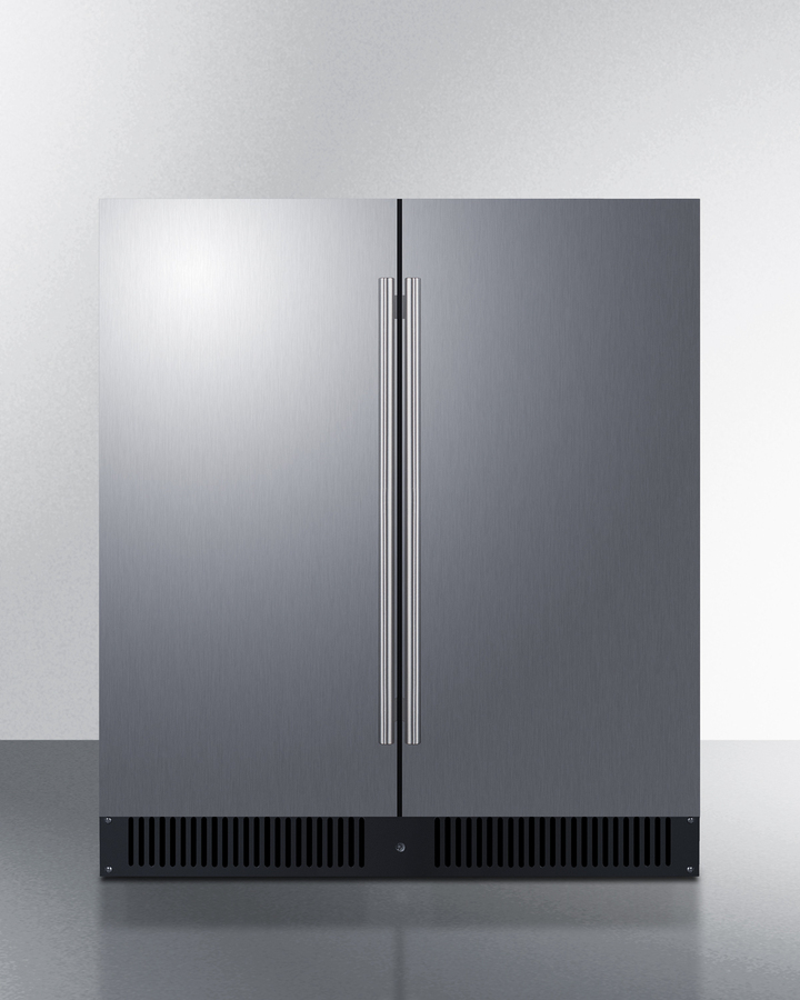 Summit manufactures unique refrigeration solutions to bring full storage functionality under the counter. Sized at 30" wide, the FFRF3070BSS is an all-in-one side-by-side refrigerator-freezer. The front breathing design allows built-in installation under counters, while the fully finished cabinet also enables freestanding use. This unit features a jet black cabinet with two stainless steel wrapped doors with pro style handles. This unit includes a lock in the kickplate to secure both sections. A sealed back and right angle plug offer added space savings. Inside, the FFRF3070BSS features a frost-free freezer compartment on the left and frost-free refrigerator compartment on the right. The refrigerator includes a digital thermostat allowing users to manage the temperature in each compartment, with a readout in Celsius or Fahrenheit for added convenience. Adjustable glass shelves offer cleaner spill-proof storage for fresh food items, while two removable door shelves provide additional storage space as needed. The freezer compartment includes adjustable wire shelves to ensure proper cold air circulation. Both sides feature LED lighting to provide an attractive, energy efficient presentation. The slotted floor design is ideal for keeping bottles safely in place. Additional features include an open door alarm, high temperature alarm, and Sabbath mode setting that allows you to disable certain functions during religious observance. With its innovative all-in-one design, user-friendly features, and full frost-free operation, the FFRF3070BSS is a great choice for smaller kitchens looking to maximize storage space under the counter. Additional options are available in black or white, and with panel-ready doors. Browse the full Summit selection to discover the perfect fit for your space.