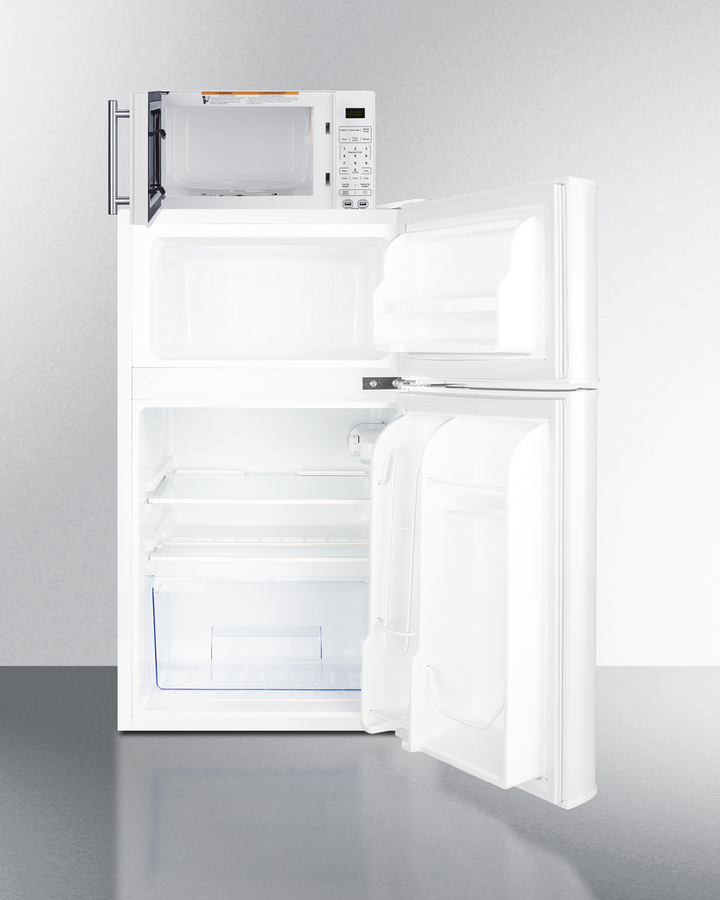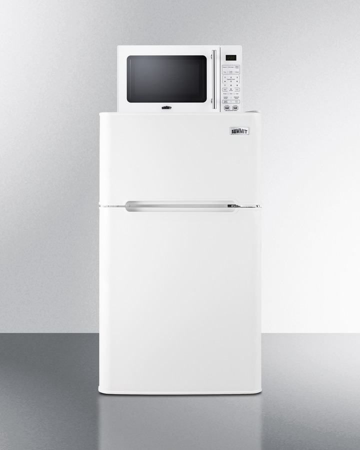 Summit's innovative MRF series offers combination refrigerator-microwaves with one-plug operation, ideal for hotels and other settings looking to maximize user convenience. Model MRF34WA combines a fully featured compact microwave with our ENERGY STAR listed two-door CP34W refrigerator-freezer. The complete unit is sized at just 19" wide for an easy fit. The refrigerator-freezer's user-reversible doors make it easy to adjust to any setting, while the microwave includes a built-in allocator, allowing you to plug the fridge directly into the microwave. The allocator will temporarily disable the power of the refrigerator while the microwave is in use, resuming after the cooking cycle is complete in order to protect against power surges. The SM904WA microwave comes in a white finish with an easy-grab handle in brushed stainless steel to complement the refrigerator. Two USB ports are included to charge mobile devices. The microwave has a door window and digital touchpad control panel with one-touch settings for common meals, including frozen food, potatoes, pizza, and popcorn. The display and end-of-cycle alerts can be disabled and muted as needed. We include two brackets that let you set the microwave on top of the refrigerator and gently secure with included adhesive. The MRF34WA ships on one pallet in three boxes (refrigerator-freezer CP34W, microwave SM904W, and our MRFKit bracket set). If you prefer to have the unit fully assembled before shipping, add option "MRFAssembly" upon order (note: this will incur an additional charge and added lead time). Alternate combinations can be created by ordering your choice of a Summit refrigerator, the SM904WA microwave, and our MRFKit. For more information, contact our product specialists at 718-893-3900 ext. 507.