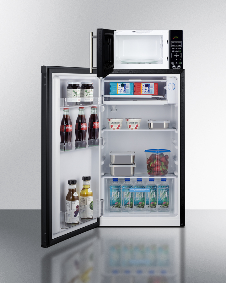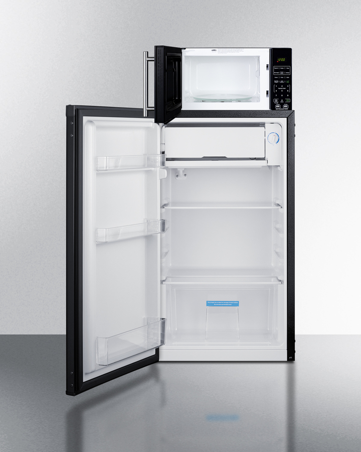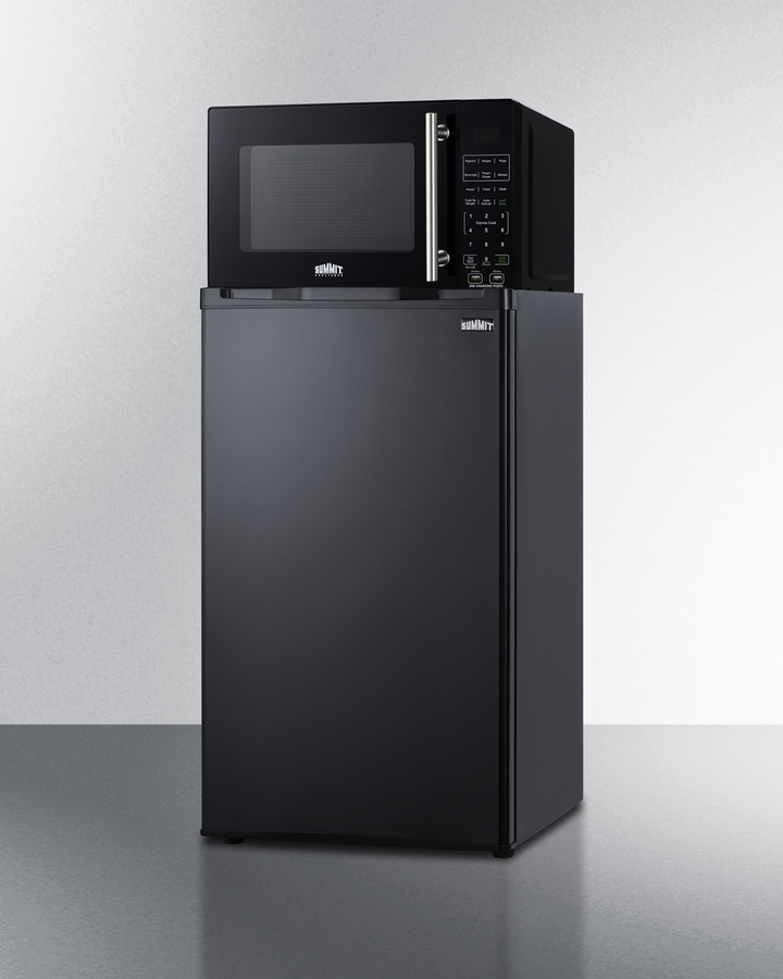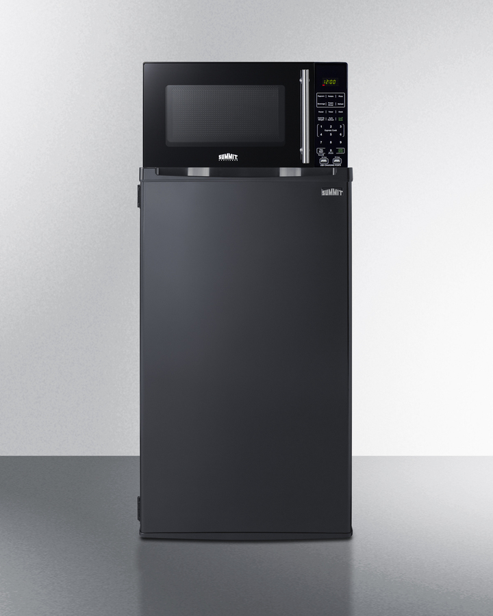 Summit's innovative MRF series offers combination refrigerator-microwaves with one-plug operation, ideal for hotels and other settings looking to maximize user convenience. Model MRF43BALHD combines a fully featured microwave(SM903BSA1) with our compact refrigerator-freezer (FF43BADALHD). The complete unit is sized at just 19" wide for an easy fit. The microwave includes a built-in allocator, allowing you to plug the fridge directly into the microwave. The allocator will temporarily disable the power of the refrigerator while the microwave is in use, resuming after the cooking cycle is complete in order to protect against power surges. The FF43BADALHD is a freestanding refrigerator that includes a large refrigerator section and an interior ice compartment. It also includes a timer accessory that converts the unit into a low-maintenance auto-defrost refrigerator-freezer. The timer allows you to program an "off" period to power off the unit and restore power after the set time. This helps to prevent ice buildup in the freezer compartment. We recommend setting the timer for 2 to 3 hours in the middle of the night. Alternatively, the refrigerator can be used without the timer and will function as a standard manual defrost refrigerator-freezer. The SM903BSA1 microwave has a jet-black finish and an easy-grab handle in brushed stainless steel. Two USB ports are included to charge mobile devices. The microwave has a door window and digital touchpad control panel with one-touch settings for everyday meals, including frozen food, potatoes, pizza, and popcorn. The display and end-of-cycle alerts can be turned off and muted as needed. We include two brackets that let you set the microwave on top of the refrigerator and gently secure it with the included adhesive. With its slim-fitting footprint and low-maintenance design, the MRF43BALHD is the ideal solution for dorm rooms, hotel spaces, offices, and other settings with limited space.