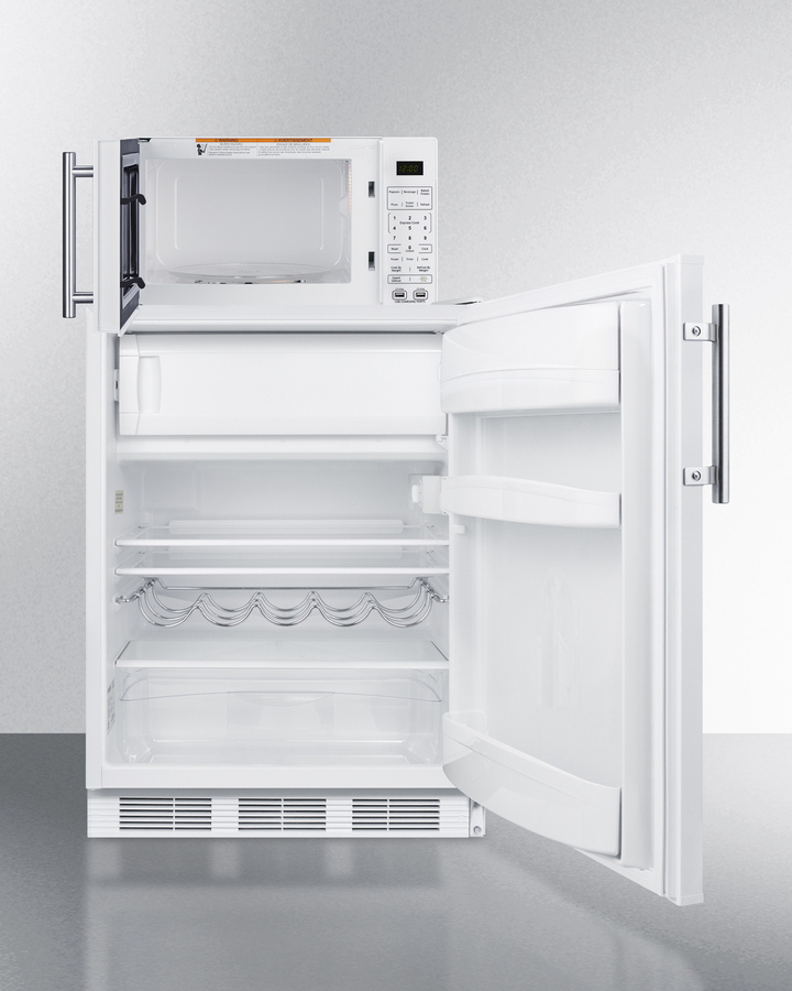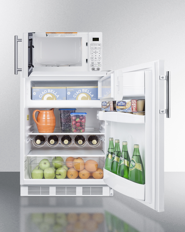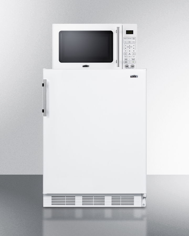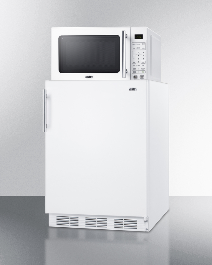 Summit's innovative MRF series offers combination refrigerator-microwaves with one-plug operation, ideal for hotels, offices, efficiency apartments, and other settings looking to maximize user convenience. Model MRF661WA combines a fully featured microwave with our European CT661W refrigerator-freezer. The complete unit is sized at just 24" wide for an easy fit. The refrigerator's reversible door make it easy to adjust to any setting, while the microwave includes a built-in allocator, allowing you to plug the fridge directly into the microwave. The allocator will temporarily disable the power of the refrigerator while the microwave is in use, resuming after the cooking cycle is complete in order to protect against power surges. The CT661W offers over 5 cu.ft. of interior storage capacity, one of the largest in this size class of undercounter refrigerator-freezers. The generously sized freezer compartment includes an interior door. Adjustable glass shelves, removable scalloped steel bottle rack, a clear crisper drawer, and door racks offer convenient storage in the fresh food section. This unit comes in white with a stainless steel handle. The SM904WA microwave comes in a clean white finish with an easy-grab handle in brushed stainless steel to complement the refrigerator. Two USB ports are included to charge mobile devices. The microwave has a door window and digital touchpad control panel with one-touch settings for common meals, including frozen food, potatoes, pizza, and popcorn. The display and end-of-cycle alerts can be disabled and muted as needed. We include two brackets that let you set the microwave on top of the refrigerator and gently secure with included adhesive. The MRF661WA ships on one pallet in three boxes (refrigerator-freezer CT661W, microwave SM904WA, and our MRFKit bracket set). If you prefer to have the unit fully assembled before shipping, add option "MRFAssembly" upon order (note: this will incur an additional charge and added lead time). Alternate combinations can be created by ordering your choice of a Summit refrigerator, the SM904WA microwave, and our MRFKit. For more information, contact our product specialists at 718-893-3900 ext. 507.