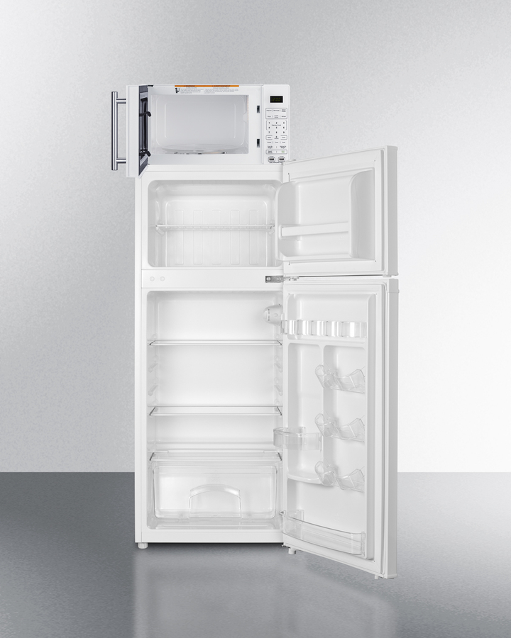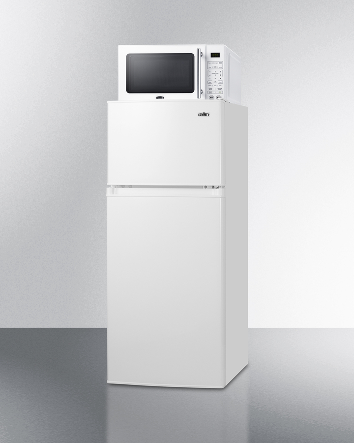 Summit's innovative MRF series offers combination refrigerator-microwaves with one-plug operation, ideal for hotels and other settings looking to maximize user convenience. Model MRF72WA combines a fully featured compact microwave with our two-door mid-sized CP72W refrigerator-freezer. The complete unit is sized at just 19" wide for an easy fit. The refrigerator-freezer comes in a white finish with user-reversible doors. The microwave includes a built-in allocator, allowing you to plug the fridge directly into the microwave. The allocator will temporarily disable the power of the refrigerator while the microwave is in use, resuming after the cooking cycle is complete in order to protect against power surges. The SM904WA microwave comes in a clean white finish with an easy-grab handle in brushed stainless steel to complement the refrigerator. Two USB ports are included to charge mobile devices. The microwave has a door window and digital touchpad control panel with one-touch settings for common meals, including frozen food, potatoes, pizza, and popcorn. The display and end-of-cycle alerts can be disabled and muted as needed. We include two brackets that let you set the microwave on top of the refrigerator and gently secure with included adhesive. The MRF72WA ships on one pallet in three boxes (refrigerator-freezer CP72W, microwave SM904WA, and our MRFKit bracket set). If you prefer to have the unit fully assembled before shipping, add option "MRFAssembly" upon order (note: this will incur an additional charge and added lead time). Alternate combinations can be created by ordering your choice of a Summit refrigerator, the SM904WA microwave, and our MRFKit. For more information, contact our product specialists at 718-893-3900 ext. 507.