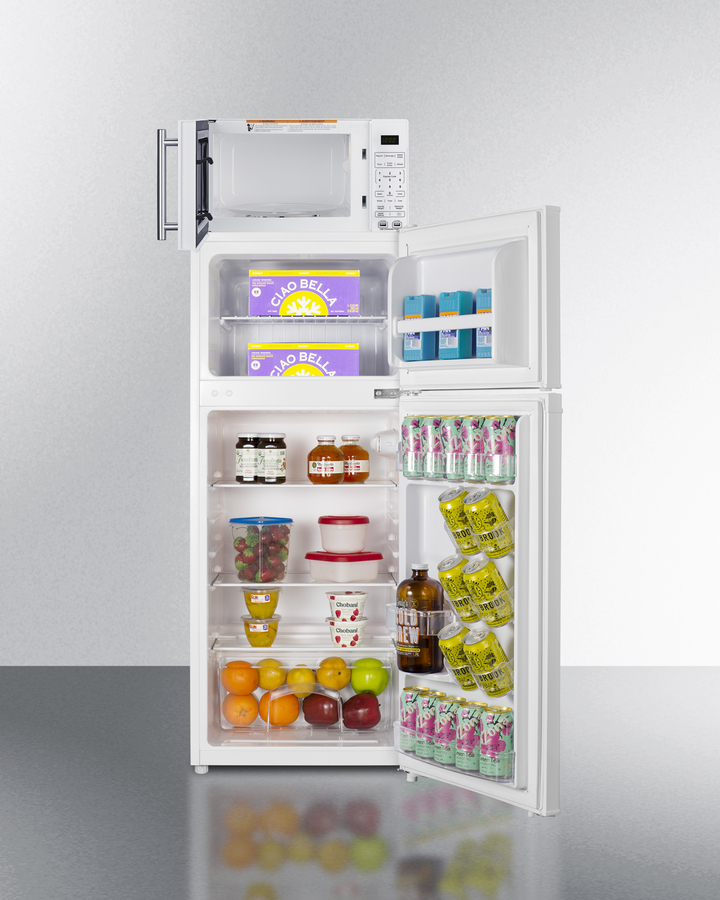 Mid-sized refrigerator-freezer and microwave with allocator offer a convenient 1-plug solution for food storage and heating