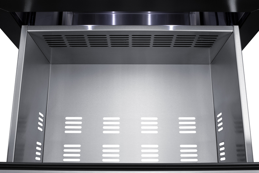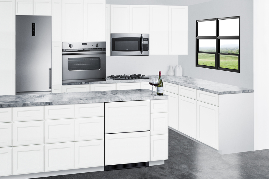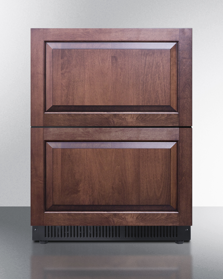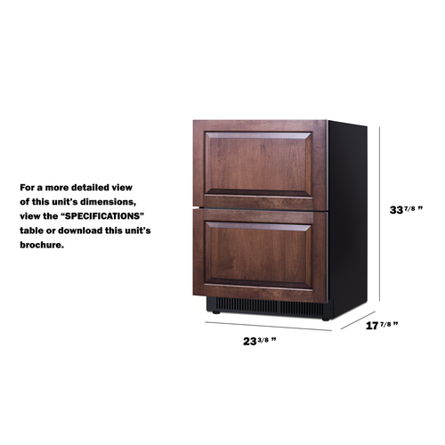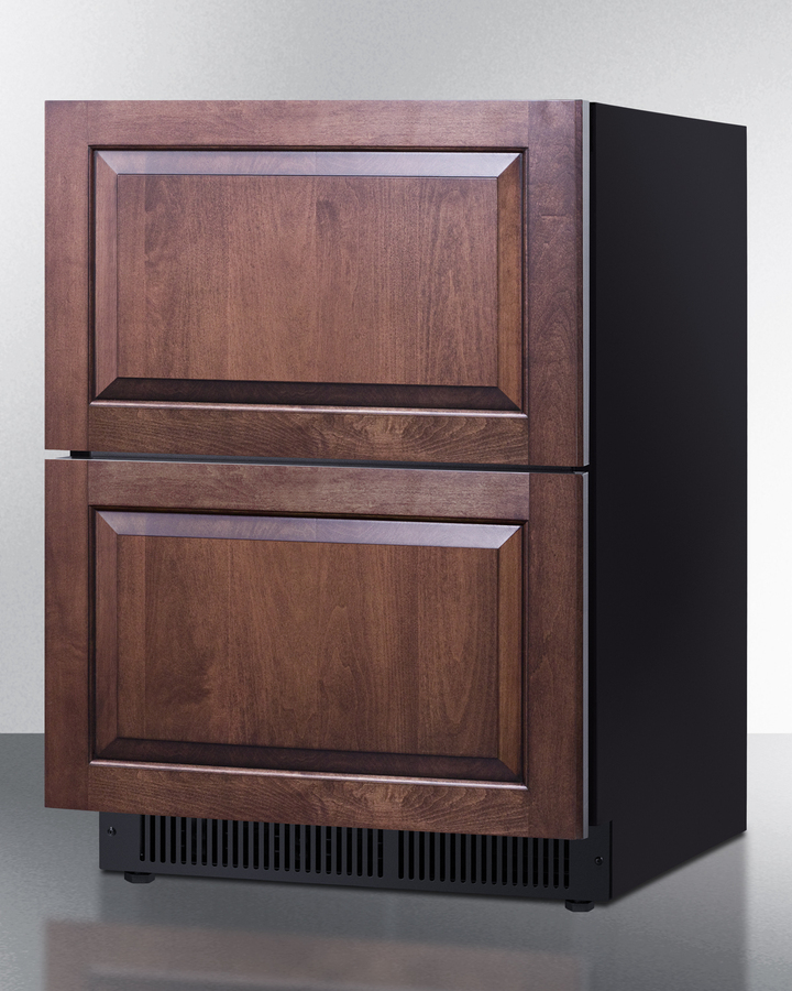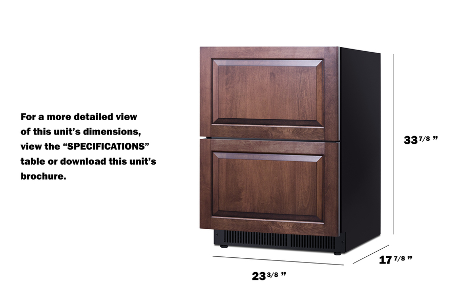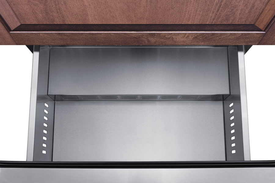 Summit's shallow depth series of built-in undercounter refrigeration brings full functionality to kitchen islands, wet bars, and other settings with space limitations. Model SDHDR2446PNR is a 24" wide 2-drawer refrigerator sized at 18" deep, with a panel-ready front specially designed for easy custom style. It comes in a 33.75" height to fit under standard height counters. The front-breathing system allows built-in installation, while the fully finished black cabinet also allows freestanding use. This unit has a sealed rear and right-angle cord for a better fit. We include two sets of two-piece brackets that allow you to easily add an overlay panel over each drawer without screwing through the front (panel dimensions: 23 1/8" W x 14 7/8" H at 3/4" thick). Each drawer comes in fully finished stainless steel. Users can use the included stainless steel handles or provide their own. Inside, the SDHDR2446PNR has a generous 3.4 cu.ft. capacity to accommodate your storage needs. Frost-free operation ensures minimal user maintenance, with fan-forced cooling to evenly distribute the temperature. A digital thermostat, located atop the upper drawer, makes it easy to manage the temperature, with an LED display that can be read in Celsius or Fahrenheit. Two removable dividers allow you to separate the drawer compartments for easy organization. A child lock will disable the digital controls after two minutes of inactivity to prevent accidental adjustments. Additional features include audible alarms for high-temperature fluctuations and open drawer alerts, a temporary memory function to recover all settings in the event of power loss, and sabbath mode to disable certain electrical features during periods of religious observance. The SDHDR2446PNR refrigerator is ETL-S listed to NSF-7 commercial standards but can also be used in the home. With its deluxe style, user-friendly features, and uniquely shallow depth, this unit offers premium value for a variety of settings. Additional 18" deep choices are available in a variety of styles, including 15", 19", and 24" widths, as well as outdoor refrigerators, wine cellars, and more. Browse the full selection to find your perfect fit.